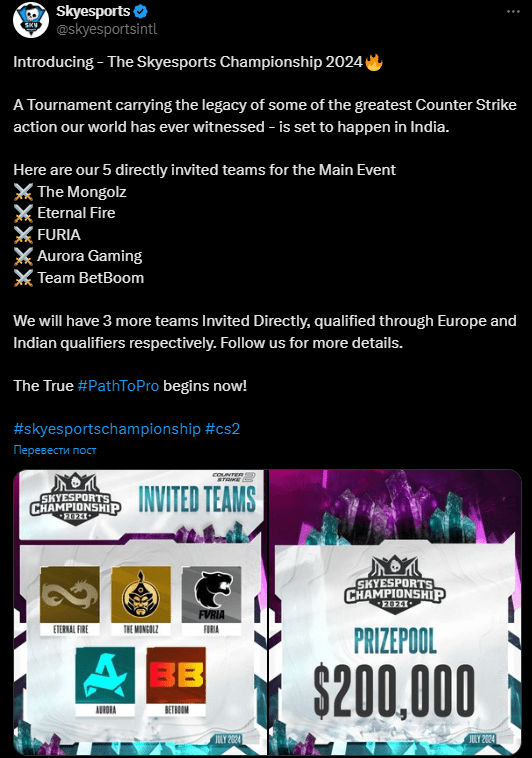 Skyesports, ведущий организатор турниров, официально объявил о долгожданном Skyesports Championship 2024 — престижном LAN-мероприятии, которое пройдет с 23 по 28 июля в Индии. Этот элитный киберспортивный турнир будет иметь значительный призовой фонд в размере 200 000 долларов и в нем примут участие восемь команд мирового уровня. Уже раскрыты участвующие команды, и волнение ощущается повсюду. Eternal Fire, грозная организация киберспорта, получила приглашение участвовать в Skyesports Championship 2024. Кроме того, Aurora, победители Skyesports Masters 2024, также заняли место в турнире благодаря своему впечатляющему выступлению. Остальные места будут распределены через комбинацию прямых приглашений и квалификационных мероприятий. Одной команде будет отправлено прямое приглашение, а остальные места определят через квалификации в Европе и Индии, что обеспечит разнообразный и конкурентный состав. Skyesports имеет подтвержденный опыт предоставления исключительных киберспортивных впечатлений, и Skyesports Championship 2024 обещает не стать исключением. Турнир безусловно привлечет внимание энтузиастов киберспорта и случайных зрителей, которые с нетерпением ждут столкновения титанов на виртуальном поле боя. Skyesports объявил о мероприятии в своих социальных сетях, подчеркнув, что этот турнир продолжит наследие величайших соревнований по Counter-Strike, укрепляя его статус как ведущего киберспортивного направления. Решение провести Skyesports Championship 2024 в Индии подчеркивает растущую значимость страны в глобальной киберспортивной сцене. Участвующие команды получат возможность продемонстрировать свои навыки, стратегии и командную работу на мировой арене, борясь за престижный титул Skyesports Championship 2024 и изменяющие жизнь призовые деньги. Этот турнир не только вознаградит победителей, но и предоставит платформу для начинающих профессионалов киберспорта, чтобы показать свой талант и, возможно, начать свою карьеру. Skyesports Championship 2024 обещает стать захватывающим шоу лучших талантов мировой киберспортивной сцены, поскольку самые умелые и успешные команды соберутся для борьбы за желанный титул чемпионата. Болельщики смогут ожидать напряженных и захватывающих матчей, которые расширят границы соревновательного гейминга, демонстрируя вершину стратегического мастерства, механического владения и командной работы. Одним из ключевых моментов Skyesports Championship 2024 является участие Aurora, действующих чемпионов Skyesports Masters 2024. Их участие в турнире подтверждает их исключительное выступление и признание, которое они заслужили в киберспортивном сообществе. Победа Aurora в Skyesports Masters 2024 безусловно сделала их серьезным претендентом, и их участие в Skyesports Championship 2024 без сомнения добавит волнения и ожидания вокруг события. Прямое приглашение, предоставленное одной из участвующих команд, дополнительно подчеркивает престиж и важность Skyesports Championship 2024. Это приглашение-специальное место предназначено для команды, которая продемонстрировала последовательное превосходство и заслужила уважение киберспортивного сообщества. Включение этой команды, получившей прямое приглашение, добавит дополнительный уровень интриги и конкуренции, поскольку остальные команды будут стремиться свергнуть уважаемого приглашенного.