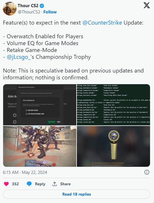 И, возможно, самое захватывающее — есть сообщения о том, что игроки, участвовавшие в плей-офф PGL Copenhagen Major 2024, наконец получат свои долгожданные трофеи. Прошло более 50 дней с момента события, и это, безусловно, станет приятным завершением этого турнира для заслуженных чемпионов. «Задержка с выдачей этих трофеев была настоящим источником разочарования, особенно для игроков, которые их заработали», прокомментировал ThourCS2. «Я знаю, что в частности jL очень хотел получить этот трофей, и уверен, что он и остальные финалисты будут очень рады наконец-то получить признание за свои достижения.» Хотя точное время выхода этого обновления пока неизвестно, игроки уже заметили изменения в ветке «atest» CS2, так что кажется, что релиз может быть совсем скоро. Не нужно говорить, что сообщество Counter-Strike в полном ожидании того, что грядет. Помимо подтвержденных нововведений, ThourCS2 также предполагает, что обновление может включать другие значительные улучшения и новые функции. Одной из областей, которая, по его мнению, получит значительные улучшения, являются графика и визуальные эффекты игры. «С переходом на Source 2 я ожидаю, что мы увидим существенное визуальное обновление в Counter-Strike 2», предположил ThourCS2. «Valve действительно расширяет границы возможного с рендерингом в реальном времени, и я думаю, что нас ждут впечатляющие улучшения в освещении, текстурах, моделях персонажей и деталях окружения.» Улучшенная графика не только сделает игру лучше визуально, но и может иметь ощутимые преимущества в геймплейе. «Лучшее визуальное восприятие означает, что игроки смогут легче идентифицировать цели, отслеживать движения и в целом получать более четкую картину происходящего на карте», объяснил ThourCS2. «Такая улучшенная визуальная информация может привести к более быстрым реакциям и более точной прицеливанию.» ThourCS2 также считает, что Counter-Strike 2 может ввести новые механики геймплея, чтобы встряхнуть основную формулу Counter-Strike. Это может включать добавление новых типов оружия, экипировки или даже режимов игры, которые предложат свежий опыт для ветеранов. «Counter-Strike всегда был о владении очень конкретным набором оружия и тактик, но я думаю, что Valve понимает необходимость эволюционировать геймплей, чтобы он оставался свежим», сказал он. «Будь то совершенно новое снаряжение для экспериментов или полностью новые режимы, меняющие динамику, я ожидаю увидеть некоторые инновационные идеи, основанные на классической базе CS.» Улучшения сетевого кода и систем поиска матчей также находятся в списке ожидаемых изменений ThourCS2. Он считает, что устранение проблем с онлайн-производительностью и качеством поиска матчей станет ключевым направлением для обеспечения более стабильного и беспрепятственного многопользовательского опыта. «Задержки и нестабильность сети всегда были слабым местом Counter-Strike, поэтому я предполагаю, что много работы было вложено в укрепление этих систем», отметил ThourCS2. «И с увеличением числа игроков, которое приходит с полноценным сиквелом, наличие надежного и умного алгоритма поиска матчей будет критически важным для поддержания напряженных, соревновательных матчей.» Конечно, поскольку это всего лишь обоснованные догадки, а не официальные подтверждения, игрокам придется ждать, пока Valve не раскроет реальные детали обновления Counter-Strike 2. Но исходя из инсайто