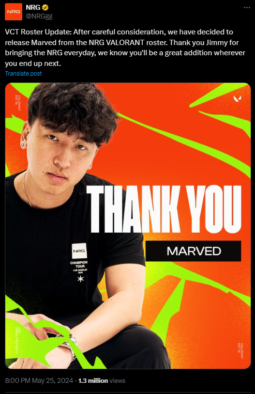 На 26 мая североамериканская организация киберспорта NRG официально объявила о изменениях в своем составе Valorant. Команда рассталась с игроком Marved, а Demon1 был переведен на скамейку запасных. Эти корректировки состава происходят на фоне стратегических изменений в их соревновательном составе Valorant перед предстоящими турнирами и событиями. Marved был ключевым участником команды NRG Valorant с момента основания, помогая им достигать успехов на нескольких престижных турнирах. Однако организация посчитала, что пришло время расстаться с этим игроком, чтобы взять состав в новом направлении. Demon1, еще один долгосрочный участник команды NRG Valorant, был переведен на скамейку запасных, вероятно, команда ищет новые таланты и комбинации игроков.